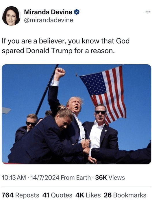 Our inaugural winner is Miranda Devine. Miranda is best known for fleeing Australia after being found to have defamed a disabled child. Classy. Below is her take on why God spared Trump but let an innocent Father die in the crossfire.